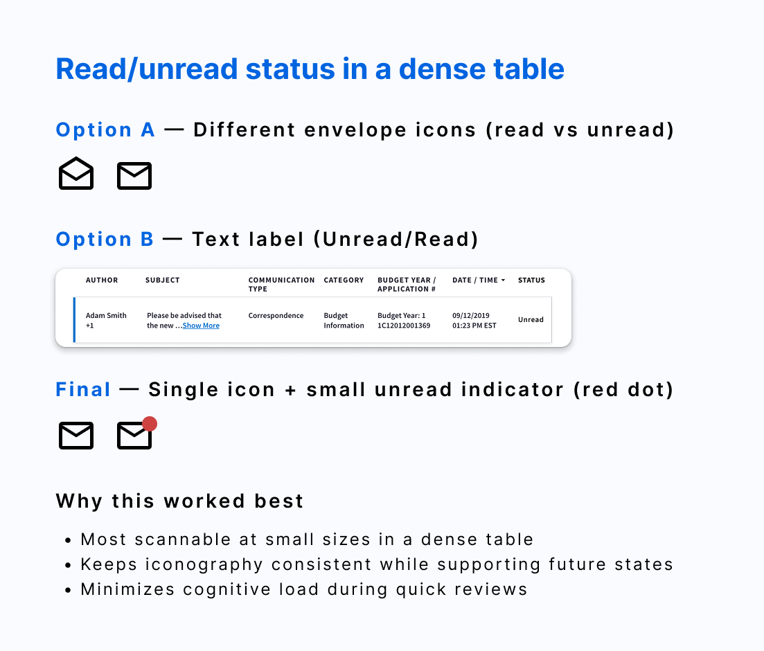 The legacy Grant Notes interface relied on dense tables with limited visual indicators, making it difficult for users to quickly identify new or unread messages. One of the first design challenges was determining how to clearly indicate message status. I explored multiple approaches before selecting a single icon with a subtle unread indicator, which provided better visual scanning while minimizing interface clutter.